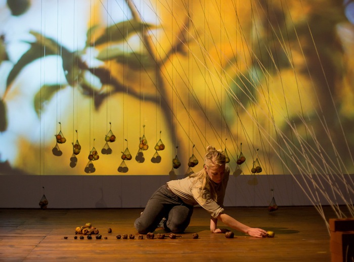 The piece centres around a sculptural system of pulleys and counterweights with which the audience interacts. Each audience member is given the end of a string and, as they pull and release, they manipulate a complex and beautiful sound-world.