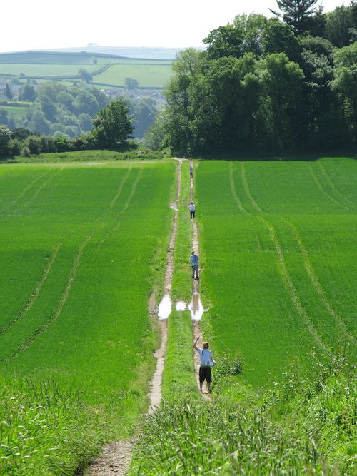 Snare Drums... is a site specific piece originally conceived for and performed in a field on the Dartington estate. The piece uses the distances in the space to dictate the rhythm. Taking into account the speed of sound through air, it involves four drummers spread out in a straight line from the audience. Using brightly coloured flags, a conductor provides repeated visual cues for the drummers to strike their drums simultaneously. Due to the distance, the sound of each drum arrives at the audience's ears at different times.